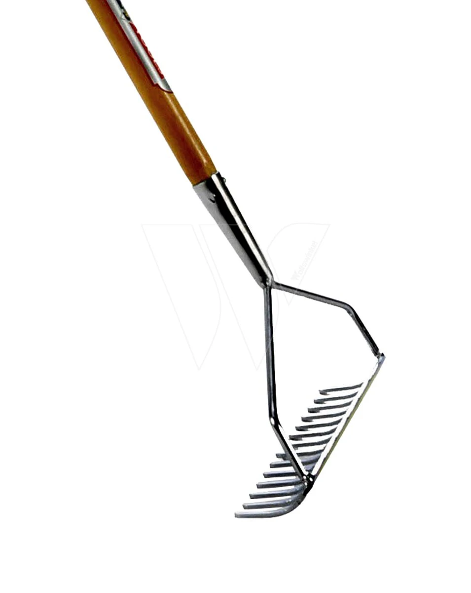 Deze beugelhark 14-tands is geschikt voor het verwijderen van tuinafval uit de borders en het egaal harken van grind. Deze beugelhark heeft 14 tanden. De keuze voor het aantal tanden is afhankelijk van wat voor oppervlakte er geharkt moet worden. Deze beugelhark word aan de steel verbonden door een beugel waardoor de hark extra sterk is.